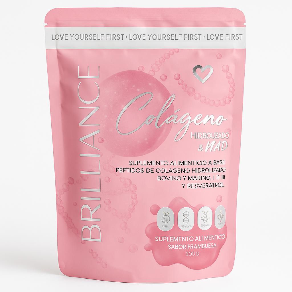 Brilliance es un suplemento alimenticio con sabor frambuesa que combina péptidos de colágeno bovino y marino tipo I, II y III con superingredientes como biotina, ácido hialurónico, resveratrol y vitaminas esenciales que tu cuerpo ama.